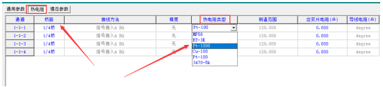 軟件“通道參數(shù)欄”->“通用參數(shù)”頁面,設(shè)置指定通道“測量類型”為“熱電阻”。