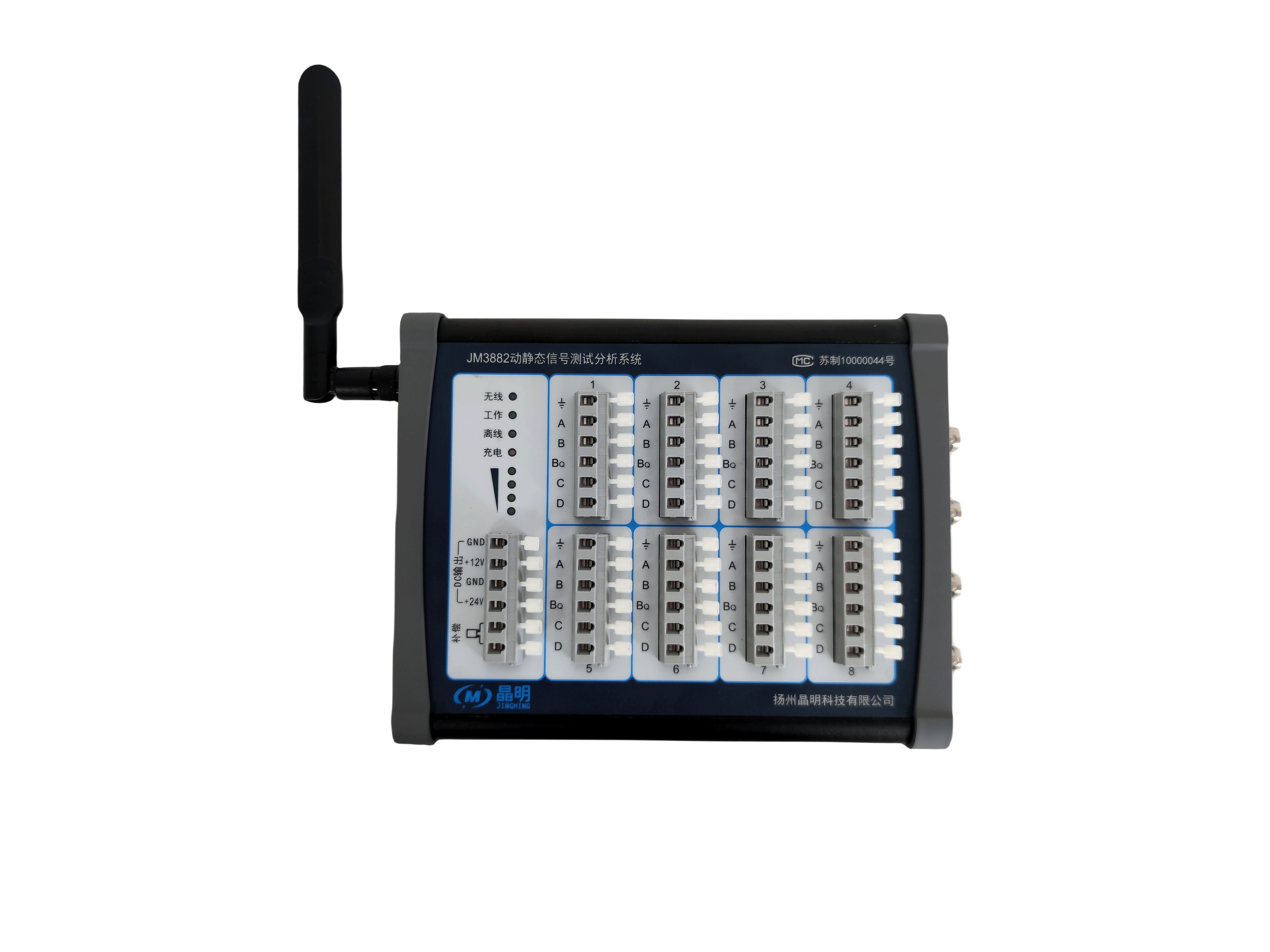 JM3882動靜態(tài)信號測試分析系統(tǒng)是一款支持靜態(tài)和低速動態(tài)應變測試的高性能應變儀,特別適合測點分布相對分散的工程測試場合,所有測點同步進行采集。系統(tǒng)支持以太網(wǎng)本地及WIFI無線測試。儀器內(nèi)置鋰電池工作,也支持邊充電邊工作,并且直流供電的范圍很寬,使用十分便捷;儀器每個測點橋路獨立設置,每臺儀器有一個補償片接入端子,可在軟件中分別為每個測點選擇補償片,現(xiàn)場測試方式更加靈活。每個測點設有應變接線端子和BNC輸入端子,可接應變片、拾振器、IEPE型傳感器、各種橋式傳感器,可以測量應力應變、加速度、溫度、力等信號,廣泛應用于橋梁、建筑的檢測試驗和疲勞試驗現(xiàn)場。差分電壓輸入時通過端子B、D接入,單端電壓和IEPE輸入時通過BNC接入。儀器每個通道采用獨立24bits ADC,具有較高的信噪比,保證每個通道同步采集,多臺儀器組網(wǎng)時也能保證所有通道的同步性。